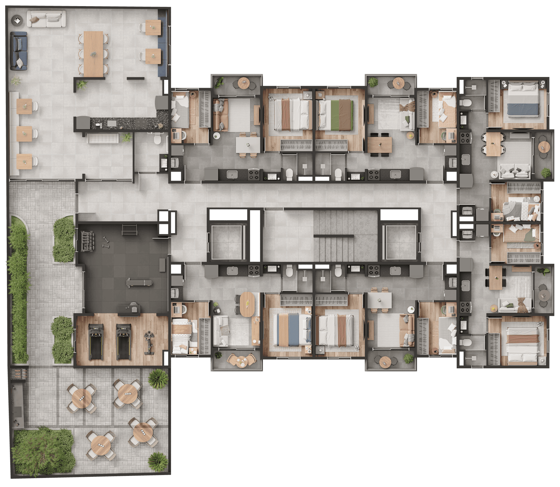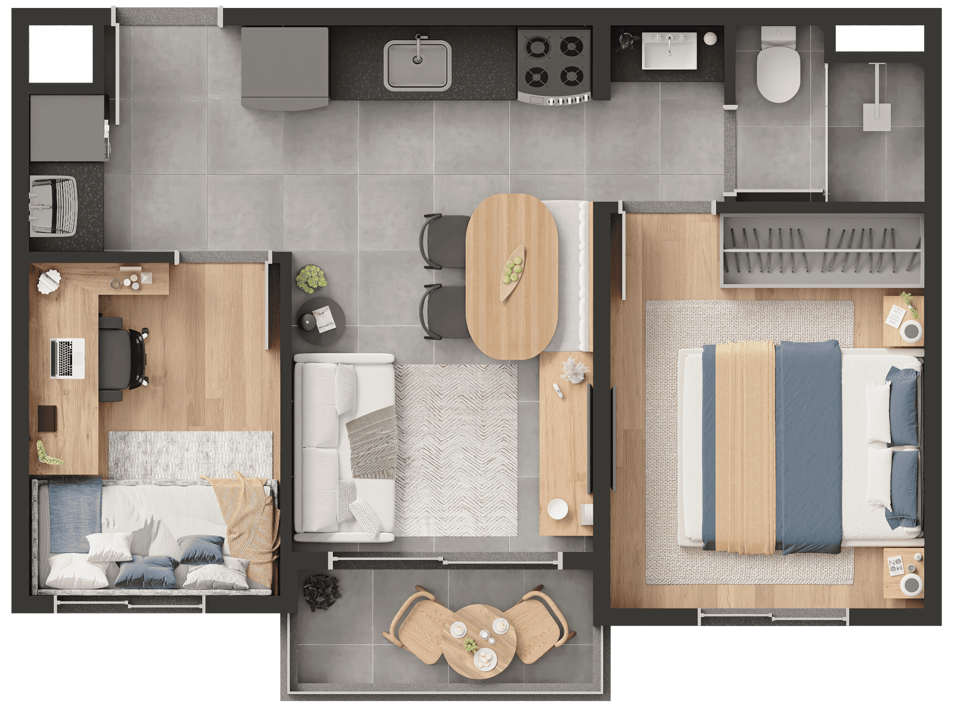 2 quartos, 1 banho, cozinha, lavanderia, sala e varanda