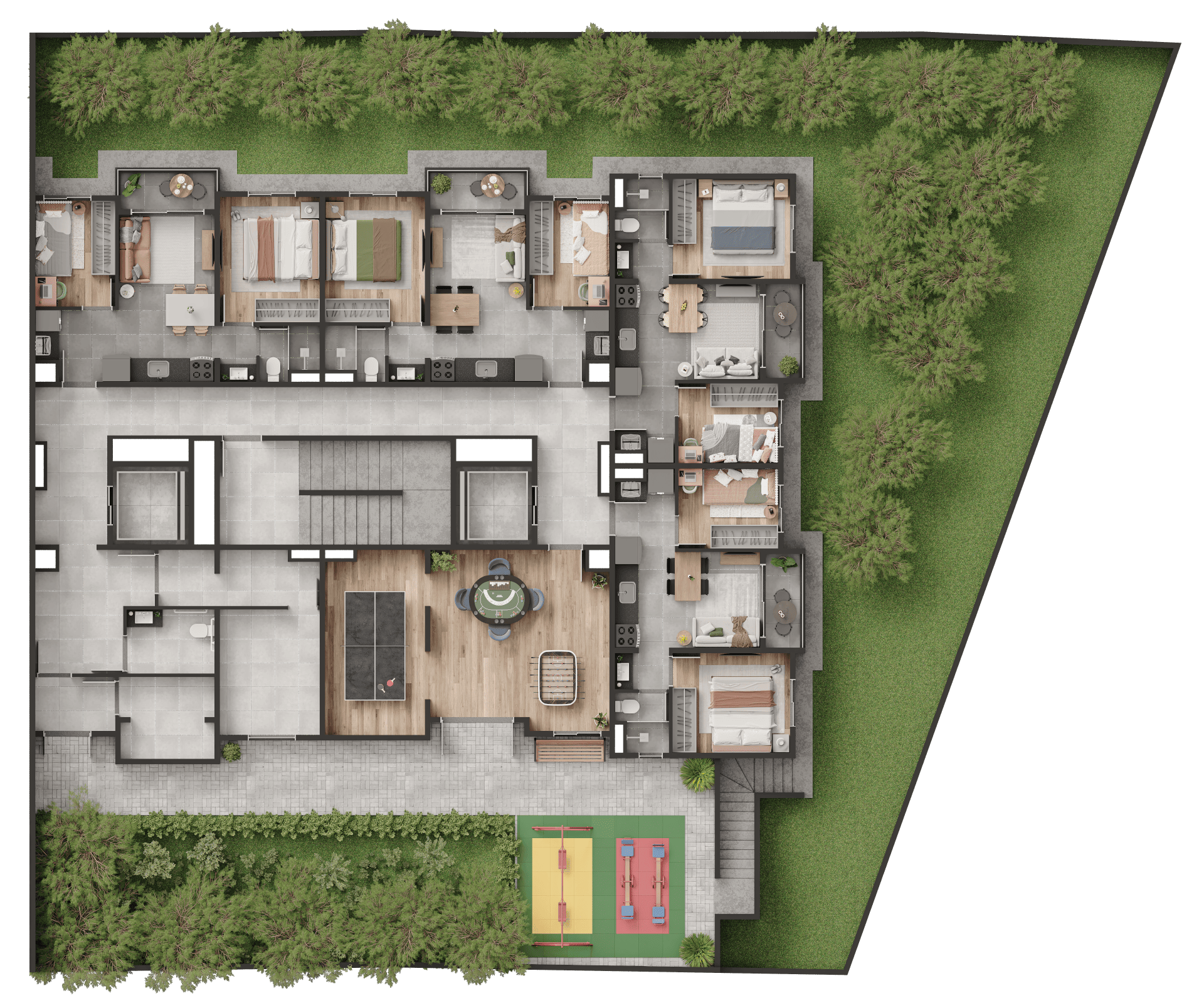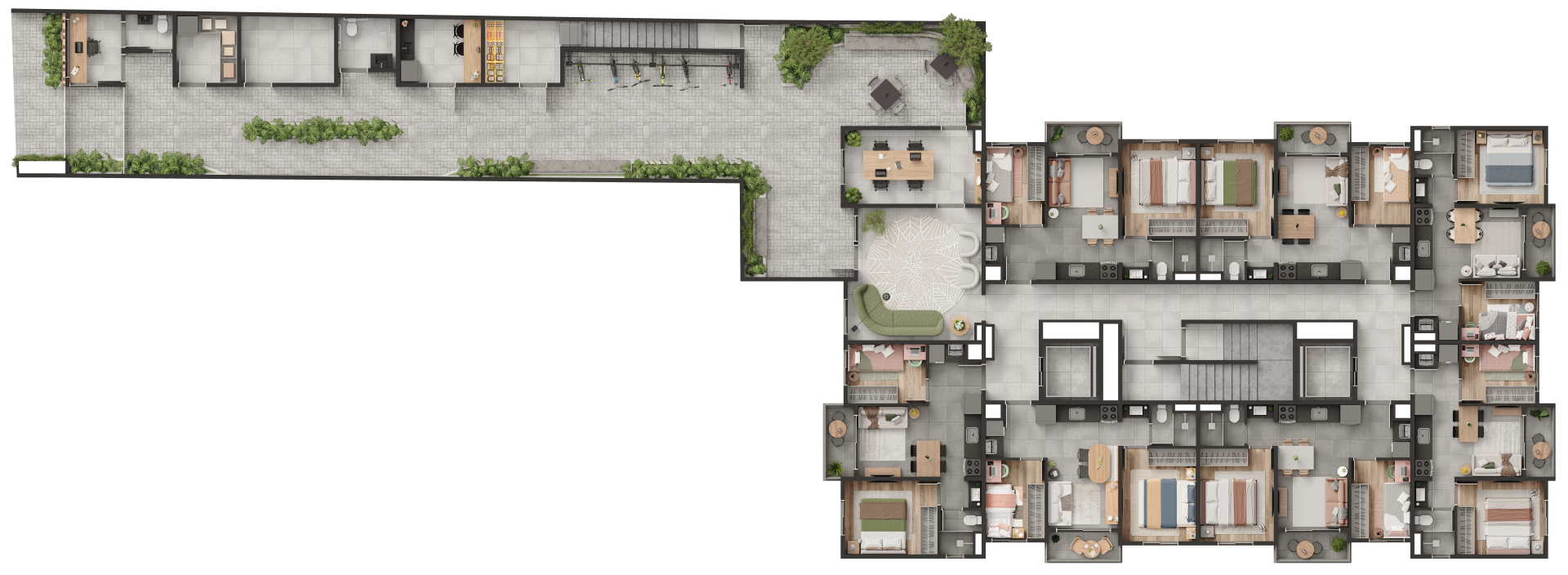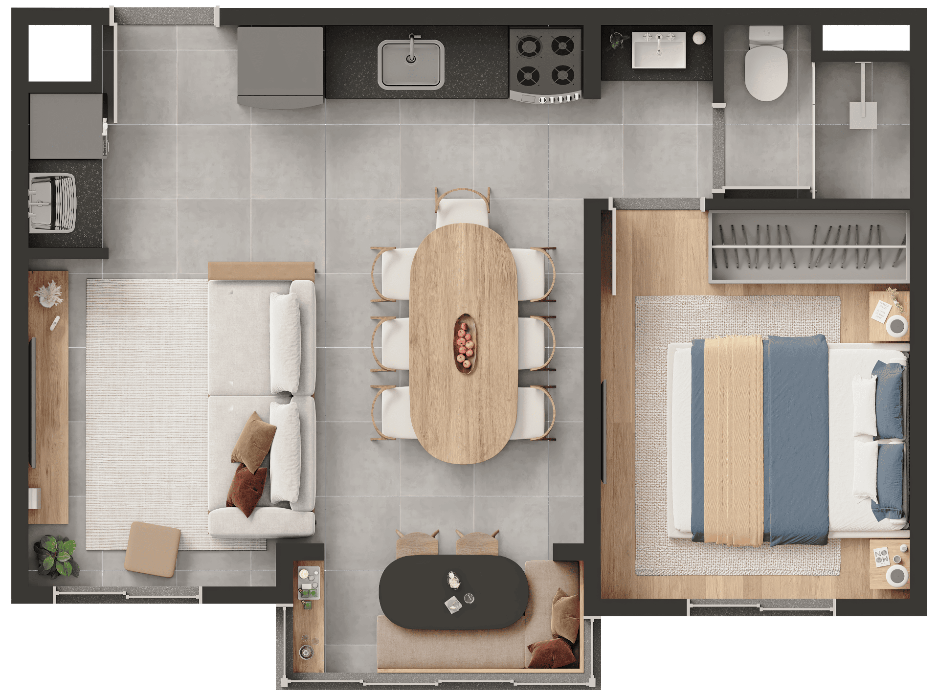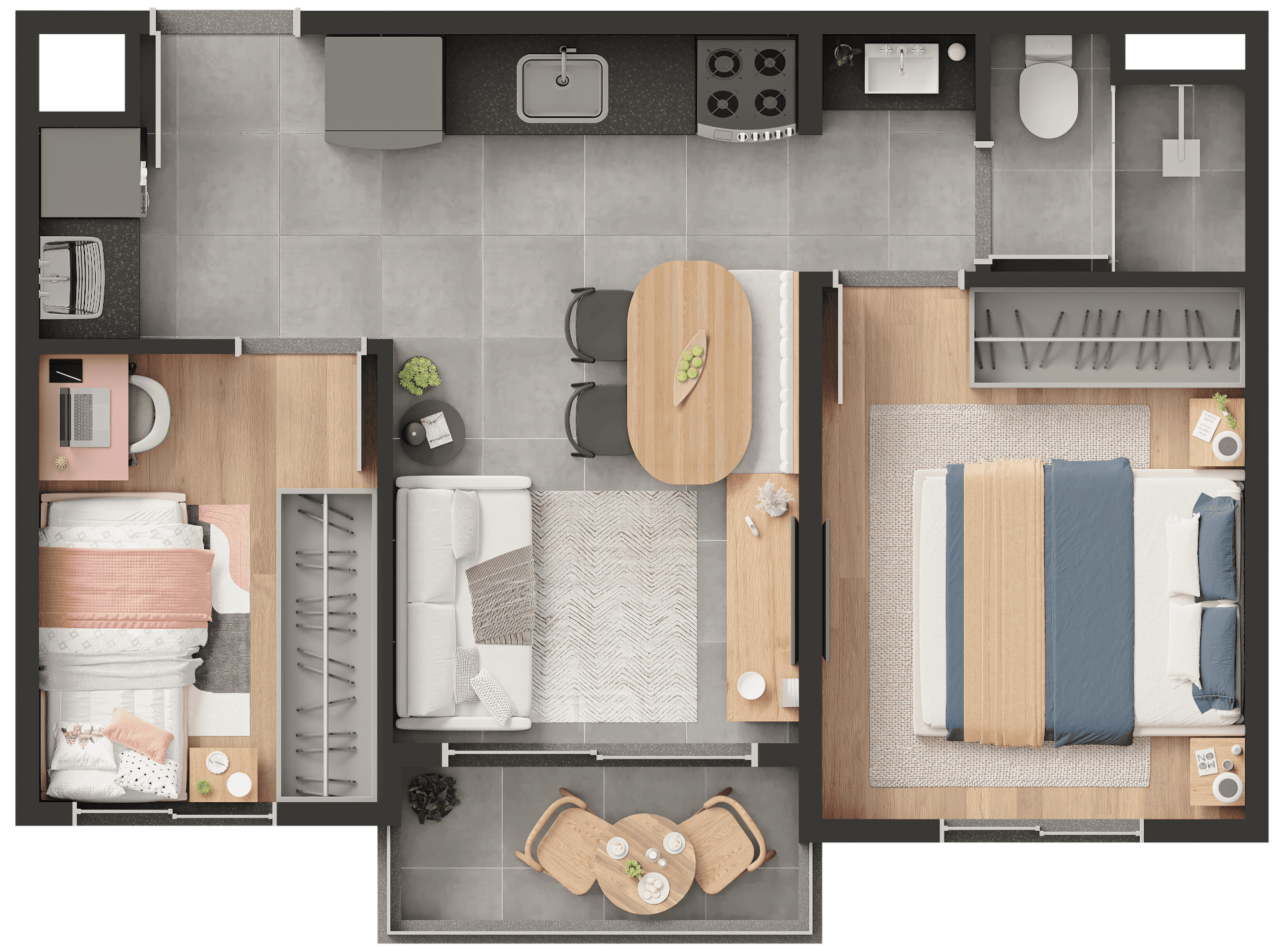 2 quartos, 1 banho, cozinha, lavanderia, sala e varanda
